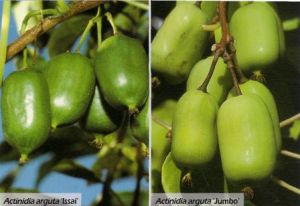 Actinidia arguta ‘Jumbo’ Актинидия острая – зона 5В. Женский сорт со съедобными крупными зелёно-жёлтыми плодами 4-5 см, в X. Достигает 8-10 м (2-3 м в год). Плодоносит на 3-4 год. Хорошим опылителем являются мужские экземпляры сора ‘Weiki’. Нуждается в свежей плодородной почве.Лучше плодоносит на солнечных защищённых местах.
