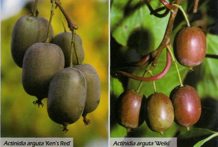 Actinidia arguta ‘Ken’s Red’ Актинидия острая – зона 6А. Женский сорт со съедобными красноватыми плодами размером 4см, в X, зелёно-пурпурные вкуснее. Достигает 8-10 м (2-3 м в год). Цветки мелкие, белые, VI. Плодоносит на 3-4 год. Хорошим опылителем являются мужские экземпляры сора ‘Weiki’. Нуждается в свежей плодородной почве.Лучше плодоносит на солнечных защищённых местах.
