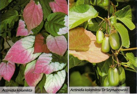 Actinidia kolomikta ‘Dr Szymanowski’ Актинидия коломикта – зона 4. Лиана с живописными листьями и съедобными плодами, женский сорт с мужскими качествами. Вырастает до 3-4 м (1-2 м в год). Листья яйцевидной формы, зелёно-бело-розовые, на солнце листья приобретаю более интенсивную окраску. . В V покрывается белыми цветами. В VIII созревают цилиндрические тёмно-зелёные, ароматные, вкусные, сладкие плоды дл. 2-3 см. Любит свежую,хорошо дренирующую плодородную почву. Нуждается в опорах.