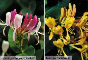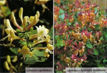 Lonicera x heckrottii ‘Goldflame’ Жимолость Хекротта– зона 5В. Долго и обильно цветущая лиана с яркими цветами. Достигает 3 м (1-2 м в год). Цветы трубчатые, розово-красные снаружи и светло-жёлтые внутри, с нежным ароматом, VI-X. Осенью красивы багряные плоды. Предпочитает почвы нейтральные, не сухие и не кислые. Рекомендуется высаживать у опор.