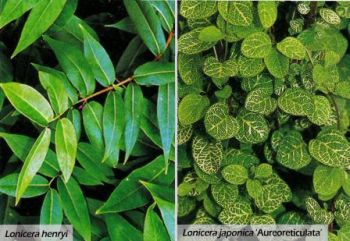 Lonicera japonica ‘Aureoreticulata’ Жимолость японская – 6А. Лиана с жёлто-зелёными листьями. Достигает 3 м (1-2 м в год). Цветы трубчатые, светло-жёлтые, немногочисленные, VI-VII. Средняя морозостойкость. Растёт на любых почвах. Рекомендуется высаживать на прикрытых, тихих и слегка притенённых участках сада у заборов и разных опор, как почвопокровник.