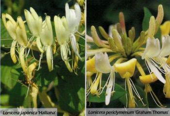 Lonicera japonica ‘Halliana’ Жимолость японская – зона 6А. Обильно цветущая вечнозелёная лиана с изначально белыми, затем жёлтыми, очень ароматными цветами, VI-X. Цветёт на прошлогодних побегах. Достигает 5 м (1-2 м в год). Предпочитает почвы нейтральные. Рекомендуется высаживать у высоких ограждений, деревьев и опор, как почвопокровник для покрытия больших территорий.
