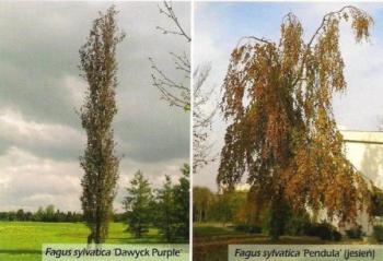 Fagus sylvatica`Pendula` Бук лесной – зона 5В. Медленно растущее небольшое дерево с плакучей, зонтиковидной кроной. Листья тёмно-красные, осе¬нью становятся красно-коричневыми. Предпочитает плодородные свежие почвы, с постоянным уровнем грунтовых вод, защищенные места. Рекомендуется для маленьких садов, как живописный контрастный элемент. Для правильного развития дерева необходимо подвязать один из побегов к опоре.