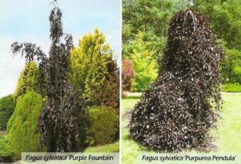 Fagus sylvatica`Purple Fontain` Бук лесной – зона 5В. Краснолистное дерево с плакучими ветвями и характерной повислой верхушкой. В 20 лет достигают 4-5 м выс. и шир. 1,5-2 м. Листья тёмно-красного цвета, блестящие, осенью желтеют. Места предпочитает защищенные, плодородные свежие почвы, с постоянным уровнем грунтовых вод. Подходит для маленьких приусадебных участков.