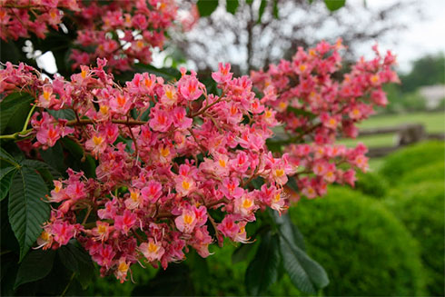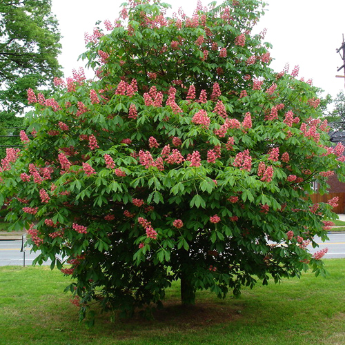 Aesculus x carnea (конский каштан розовый) ‘Briotii’ зона 6А. Дерево средних размеров, с шаровидной или ширококонической кроной. Выс. 10-15 м и шир. 8-12 м. Цветки кроваво-
