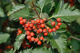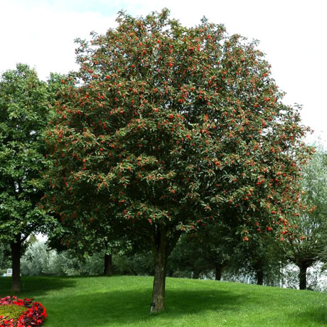 перистые, осенью жёлтые или оранжевые. Цветы белые, собранные в щитки, V-VI. Плоды очень декоративные, красные. Невысокие требования к почве. Вид пригодный для озеленения городов.