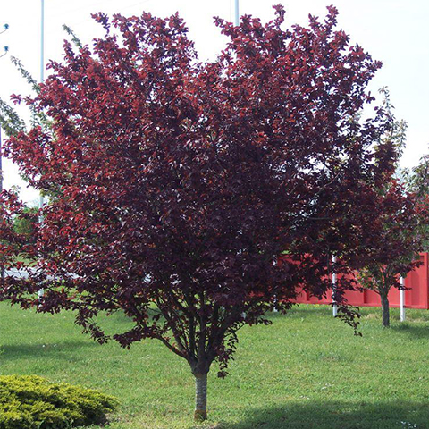 Prunus cerasifera (слива растопыренная) `Pissardii` зона 6А. Небольшое дерево с овальной кроной, достигающее 5 м выс. и 3 м шир. Листья эллиптические, с металлическим блеском, тёмно-багряные, не меняют своей окраски в течение всего сезона. Цветки белые или розовые, появляются раньше листьев, IV. Предпочитает средние почвы. Сорт устойчивый к городским условиям и засухе. Лучше высаживать отдельно или в группе, рекомендуется в виде шпалер и стриженной живой изгороди.