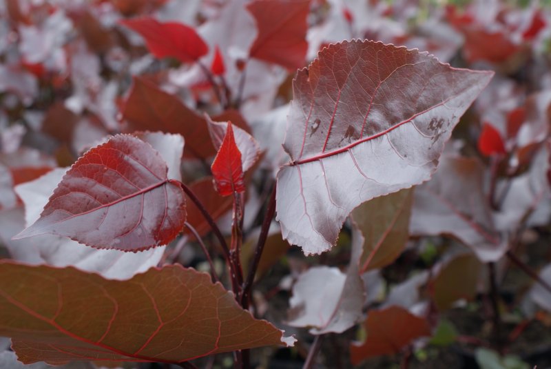 Populus deltoides (тополь дельтовидный) ‘Purple Tower’ зона 4. Новый сорт тополя с привлекательными темно-красно-фиолетовыми широкими листьями треугольной формы 15-20 см длиной и 10-12 см шириной, темно-красными стеблями с бежевыми крапинками. Характеризуется очень быстрым ростом, до 10м высотой и 3м в диаметре. Дерево с низким уровнем разветвлений, с рыхлой, куполообразной кроной. Весной молодые листья имеют фиолетовый цвет, затем зеленеют и имеют зелено-коричневый цвет. Осенью листва приобретает огненные осенние оттенки. Устойчив к неблагоприятным условиям,