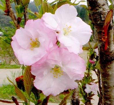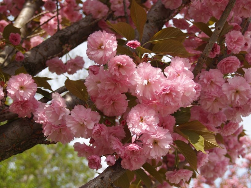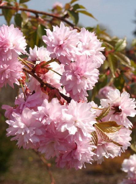 Prunus serrulata (черёмуха мелкопильчатая (сакура)) `Kiku-shidare` зона 6В. Небольшое дерево с плакучими ветвями и ажурной неправильной кроной. Достигает 5 м выс. и 4 м шир. Листья зелёные, блестящие, осенью жёлто-оранжевые. Цветки