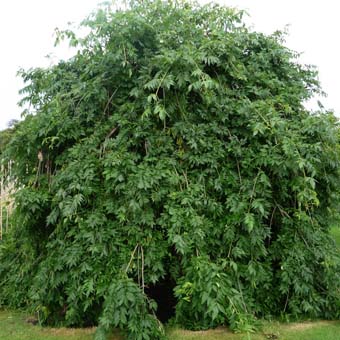 Fraxinus exelsior (ясень обыкновенный) `Pendula` зона 4. Дерево с живописной плакучей кроной. Достигает 10 м выс. и 8 м шир. Побеги вначале растут горизонтально, позднее свисают к земле, придавая кроне зонтиковидную форму. Нетребовательный, но лучше растёт на плодородных влажных местах. Рекомендуется для посадки в садах на большом газоне или у водоемов, раньше использовался для формирования естественных беседок.