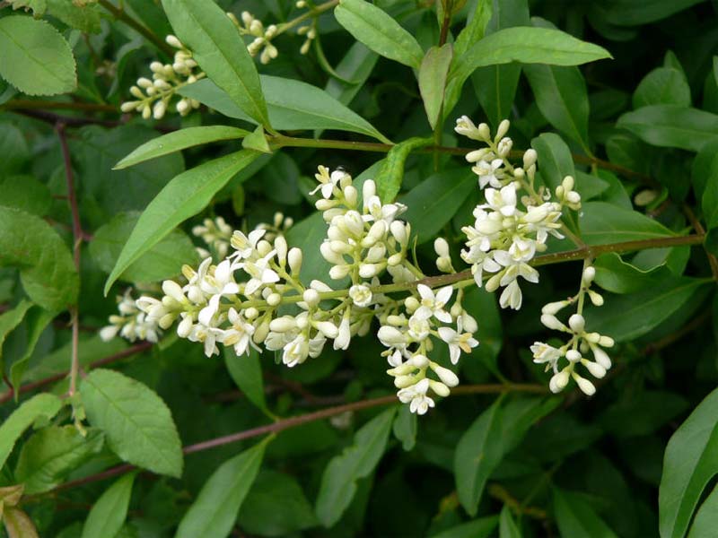 Ligustrum vulgare (бирючина обыкновенная) зона 5А. Кустарник с округлой несимметричной кроной до 5 м выс. Овальные, кожистые, темно-зеленые листья распускаются ранней весной. Цветки мелкие, белые, в густых метелках, в VI-VII. Плоды – блестящие ягодообразные, чёрные костянки, созревают в августе и сохраняются до весны. Неприхотлив, засухоустойчив, довольно морозостоек. Прекрасно растет в городских условиях. Основное растение для живых изгородей. Регулярно подстригая, можно получить плотные шпалеры выс. до 2,5 м.