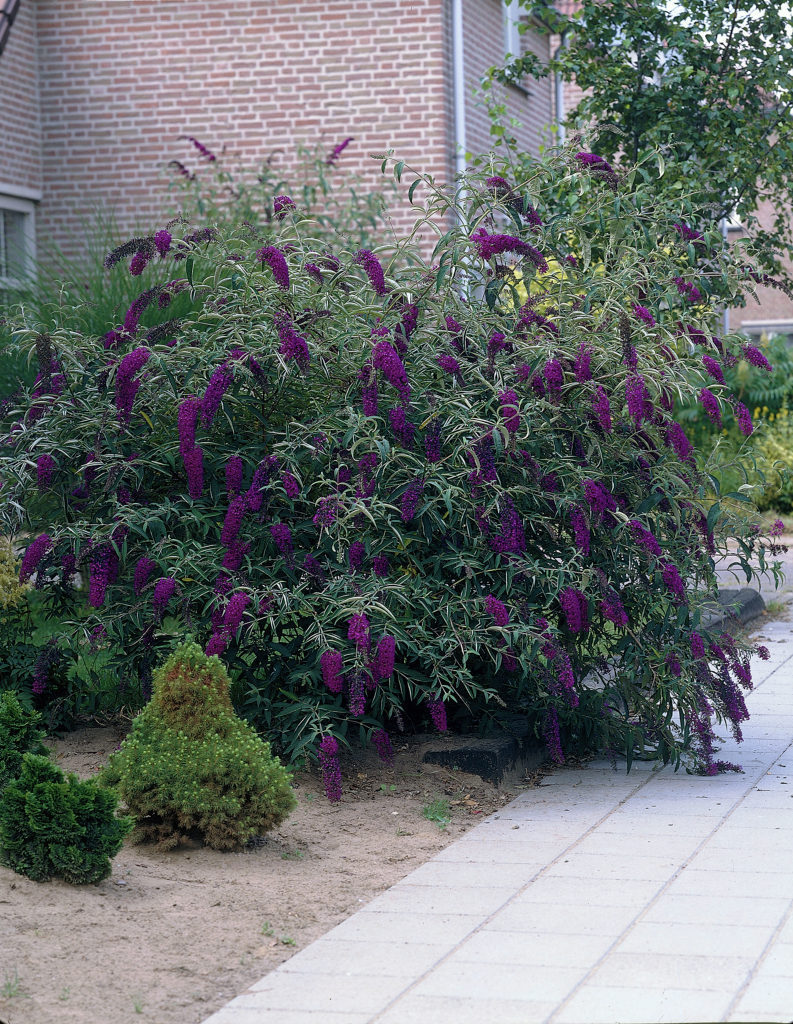 Buddleja davidii (буддлея Давида или изменчивая) ‘Black Knight’ зона 6В. Мощный кустарник с широко раскидистыми, поникающими на концах ветвями. В течение года достигает нескольких метров в выс. Цветет на побегах текущего года. Цветки от пурпурных до тёмно-фиолетовых с оранжевым глазком, в густых поникающих