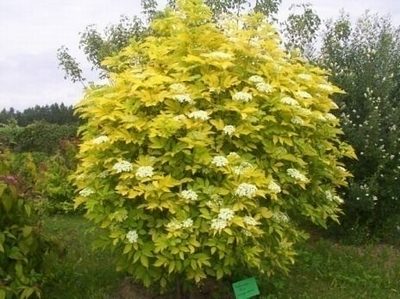 Viburnum lantana (калина гордовина) ‘Aureum’ зона 4. Густой кустарник с корневыми отпрысками. Выс. 2,5-3 м. Листья желтые, летом зелено-желтые, плотные. Цветки белые, в полушаровидных зонтиках, распускаются в V. Плоды изначально красные, позднее черные. Растет даже на сухой и бедной почве. Хорошо переносит обрезку. Рекомендуется для посадки в садах, парках, вдоль трасс, морозостойка.