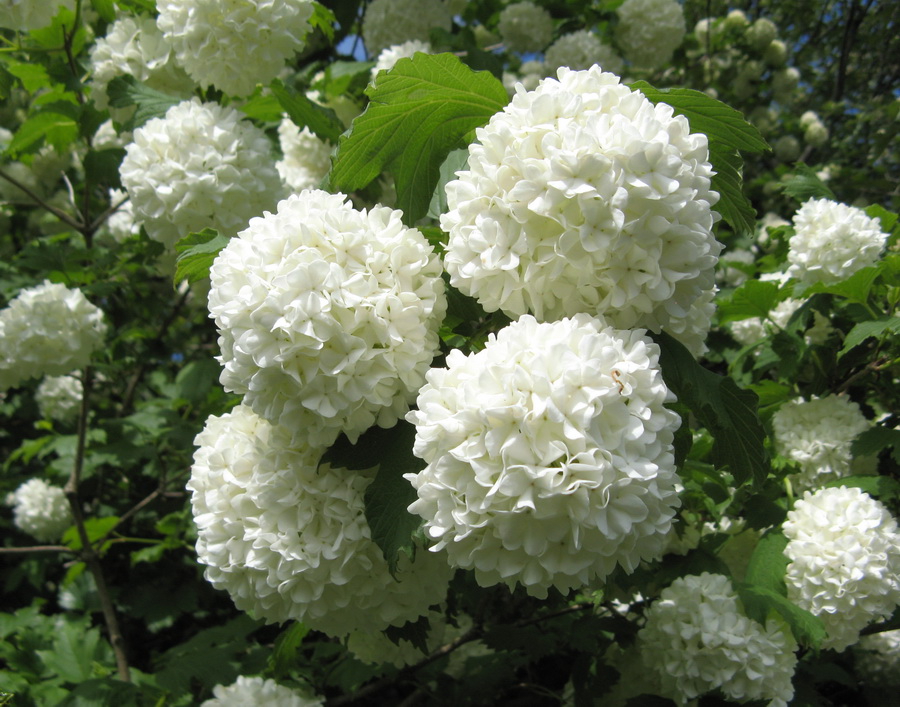 Viburnum opulus (калина обыкновенная) ‘Roseum’ зона 4. Широкий быстрорастущий куст с асимметричной разрозненной кроной выс. до 4 м. Листья светло-зелёные, осенью красно-пурпурные. Цветки белые, пустоцветы, в больших шаровидных соцветиях, V. Не плодоносит. Почвы влажные, от умеренно кислых до щелочных. Очень распространён, особенно в кантри-садиках.