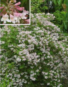 Kolkwitzia amabilis (кольквиция прелестная) зона 6А. Раскидистый кустарник с поникающими ветвями, до 2 м выс. и шир. Цветки бело-розовые, колокольчатые, V-VI. Неприхотливый. Подходит для промышленных зон и городов, для высадки под кронами деревьев, но тогда цветёт менее обильно.