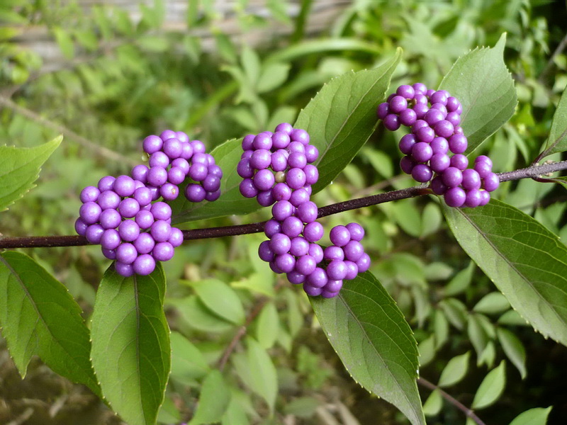 Callicarpa bodinieri (красивоплодник Бодиньера) ‘Profusion’ зона 6В. Листопадный кустарник с декоративными плодами до 2-3 м выс. Листья матовые, зелёные, осенью жёлтые. Цветки невзрачные, многочисленные, даже на молодых растениях, VII-VIII. Ягоды блестящие от пурпурных до