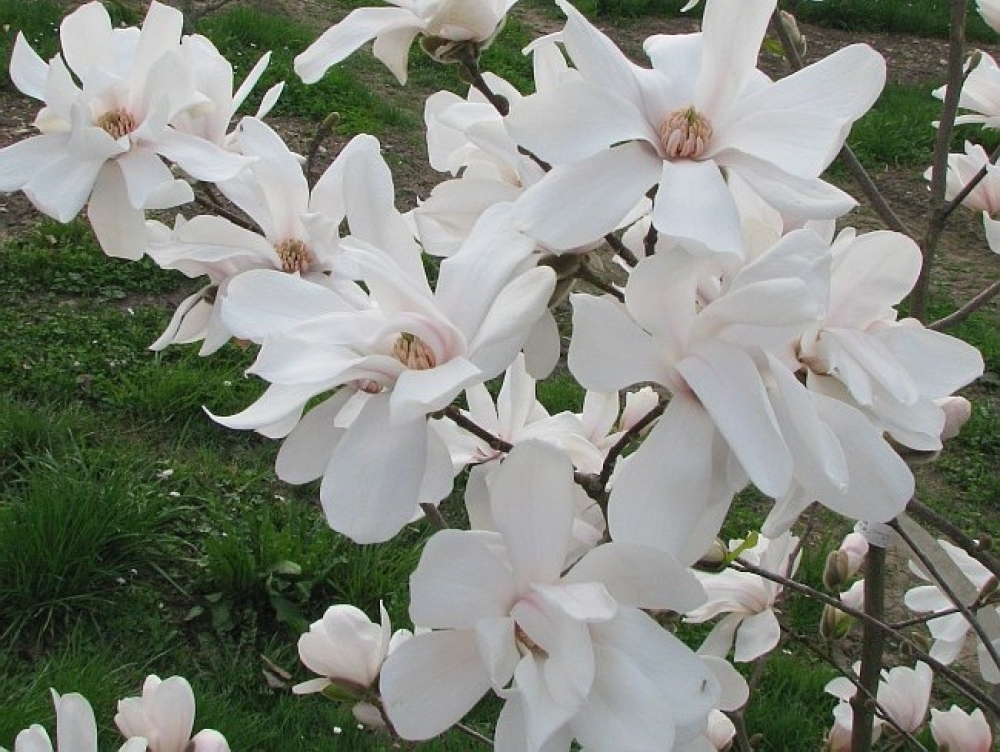 Magnolia stellata (магнолия звездчатая) зона 6А. Медленно растущий густой кустарник с округлой кроной. Выс. 2-3 м. Цветки чистого белого цвета, широко раскрытые, с многочисленными узкими лепестками, с сильным запахом, в IV. Самый ранний цветущий сорт магнолии. Предпочитает тёплые, защищенные места. Почвы свежие, плодородные, проницаемые. Выносливый ценный вид для малых садов.