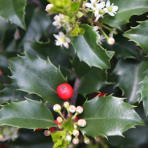 Ilex x meserveae (падуб Мезерва) ‘Blue Maid’ зона 6В. Вечнозеленый кустарник с густой кроной и прямыми побегами. 15-летние кусты достигают 1,5 м выс. и 2 м шир. Листья плотные, блестящие, кожистые, с колючими зубцами по краям, с голубоватым глянцем зимой. Цветки белые, V. Эффектные плоды — крас¬ные ягоды остаются на растении до весны. Хорошо растёт на влажной, рыхлой, проницаемой почве. Относительно морозостоек. Быстро отрастает после сильной обрезки.