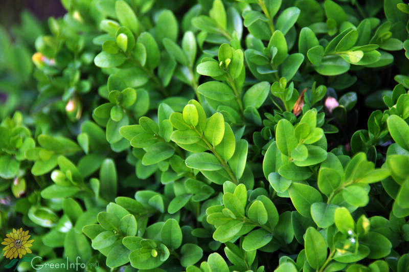 Buxus sempervirens (самшит вечнозелёный) зона 6В. Вечнозелёный медленно растущий густой кустарник, изредка вырастающий в небольшое дерево, Достигает от 2 до 4 м выс. Листья кожистые, овальные, блестящие, темно-зеленые. Цветы неприметные, медоносные. Почвы от нейтральных до