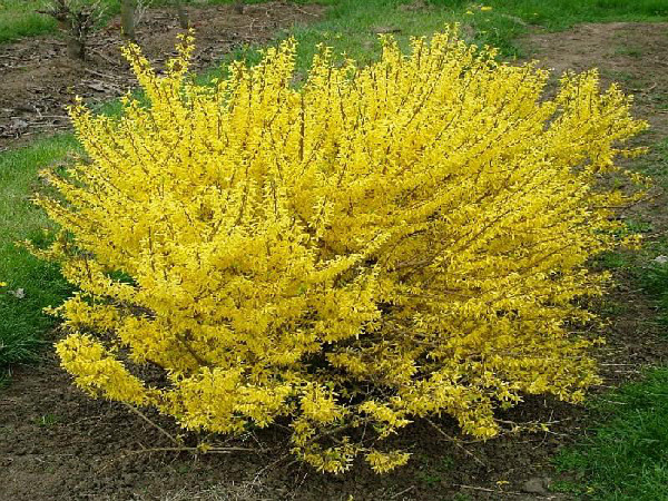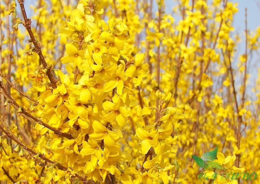 Forsythia (форзиция гибридная) ‘Maluch’ зона 5. Медленно растущий компактный кустарник. Вырастает до 1 м выс. Листья мелкие и узкие, тёмно-зелёные. Цветки жёлтые, небольшие, густо сидящие по всей длине побегов. Цветёт рано и очень обильно, IV. Предпочитает не слишком сухое место с обогащенной почвой. Устойчив к низким температурам. Подходит для малых садов.