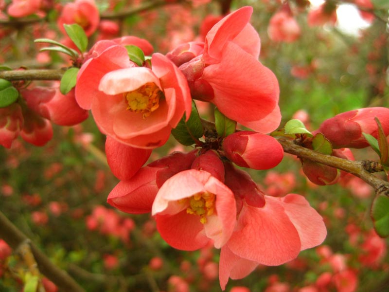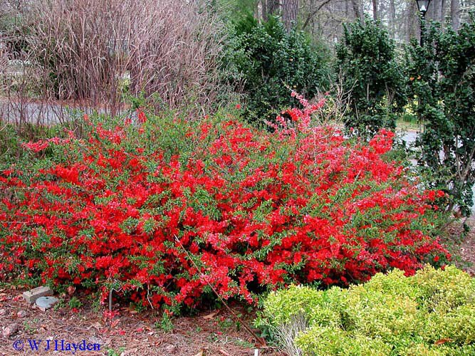 Chaenomeles japуnica (хеномелес японский или айва японская) зона 5А. Низкий раскидистый колючий кустарник до 1 м выс. Цветки крупные, кирпично-красные в щитках по 2-4, распускаются до появления листьев, Плоды жёлтые, шаровидные, приплюснутые, с приятным ароматом зелёных яблок,