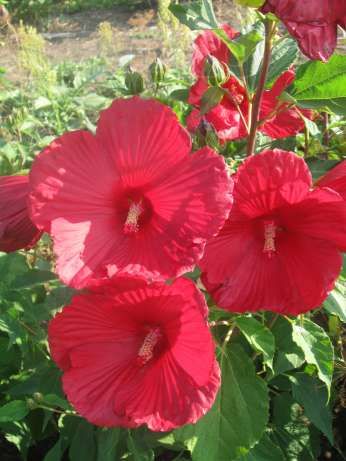 Гибискус гибридный (Hibiscus hybridus) – многолетнее травянистое растение с яркими крупными цветками и резными «кленовыми» листьями. Этот гибрид получен в середине прошлого века в результате скрещивания трех видов североамериканских гибискусов – Гибискуса остролистного (Hibiscus militaris), Гибискуса красного (Hibiscus coccineus) и Гибискуса розового (Hibiscus moscheutos). Цветут травянистые гибискусы, как правило, с начала августа и до первых заморозков (середины октября). На каждой ветке распускается около 50 цветков, похожих на цветки «китайской розы» (диаметр примерно 25 см). Каждый цветок «живет» всего один день, но их обилие создает впечатление непрерывности цветения. Самые популярные сорта гибискуса – красноцветные, розовоцветные и со светло-розовыми цветами. Красноцветные гибискусы самые высокие – они вытягиваются до 3 м. Их листья похожи на кленовые. Цветки красно-карминовой