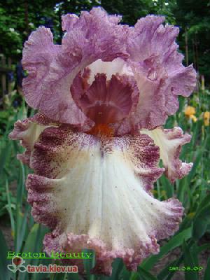 Ирис бородатый `Brothen buauty` обладает крупным цветком, окраска различная, розовато-белая. Лепестки ириса бородатого “Брозен Бьюти” ворсистые, цветение обильное и длительное в мае.