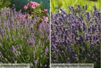 Lavandula angustifolia (лаванда узколистная) ‘Dwarf Blue’ зона 6В. Вечнозеленый, сильно ароматный кустарничек с твердыми выпрямленными побегами. Выс. ок. 0,4 м. Листья узкие, серо-зеленые. Цветки фиолетовые, VI – IХ. Устойчива к засухе, растет на легкой известковой почве. Подходит для низких обрамляющих изгородей, альпийских горок, весной можно обрезать. Чувствительна к морозам, рекомендуется укрытие.