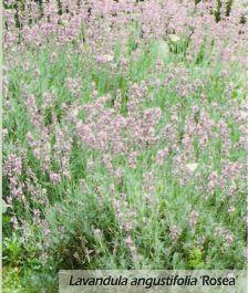 Lavandula angustifolia (лаванда узколистная) ‘Rosea’ зона 6B. Низкий вечнозеленый ароматный кустарник вырастает до выс. 0,4 м. Листья узкие, зеленые, покрыты серебристыми ворсинками. Цветки розово-лиловые, в VII-IX. Засухоустойчива, любит легкие песчаные известковые почвы. Рекомендуется на низкие бордюры, альпийские горки – в защищенных теплых местах. Чувствительна к морозам.