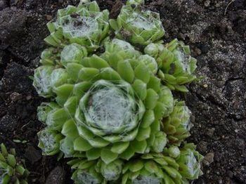 Молодило паутинистое – Sempervivum arachnoideum. Многолетнее растение с толстыми сочными листьями, образующими шаровидные или широкораскрытые прикорневые розетки. В период цветения – июнь, выбрасывают толстый, олиственный цветонос. После цветения погибают. Предпочитают открытые, солнечные, сухие и хорошо дренированные песчаные или каменистые участки. Цветёт белым, желтым или розовым.