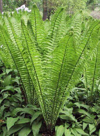 Страусник обыкновенный – Matteuccia struthiopteris. Это один из наиболее красивых и часто культивируемых в открытом грунте видов папоротников. Идеально-воронковидная розетка листьев достигает 1,7 метра. По форме спороносные листья напоминают страусовое перо, за что и дано название рода. Окраска желто-зеленая. Рекомендуется для посадки в качестве крупного многолетнего солитера или для создания заднего фона в миксбордере. Также довольно хорошо может расти на переувлажненных и открытых местах.