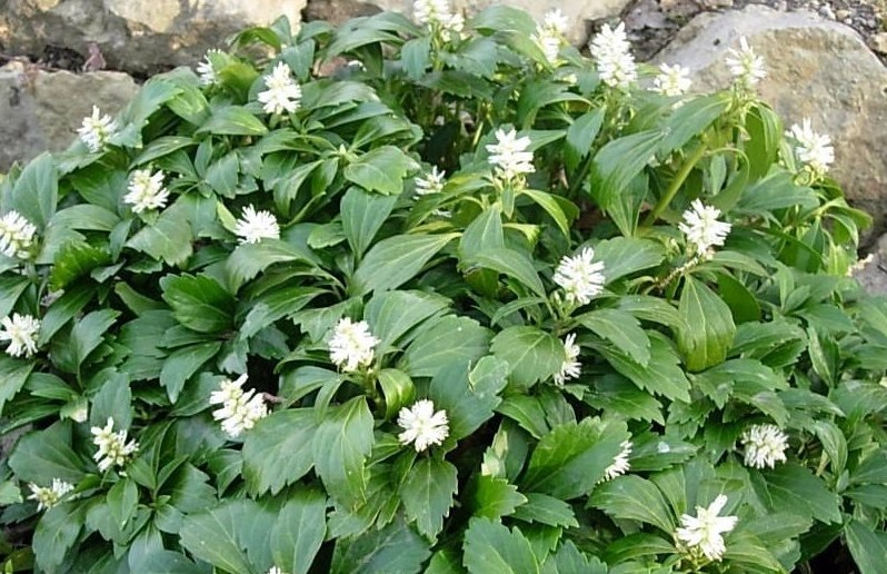 Pachysandra terminalis (пахисандра верхушечная) ‘Green Carpet’ зона 6А. Вечнозелёный кустарник стелющийся по земле, растёт медленно, образуя ковры выс. 0,2 м. Листья зелёные, гладкие, блестящие, собраны в розетки на концах побегов. Цветки мелкие, белые, в прямых соцветиях, V. Нуждается в плодородной, влажной почве. Растёт под тенью деревьев, образуя густые заросли.