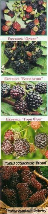 Rubus fruticosus – ежевика безколючковая “Оркан”. Побеги без колючек. Предпочитает затишные места (почки и побеги чувствительны у подмерзанию), плодородные и влажные почвы, плодоносит на двухлетних побегах в начале VIII – конце IX, 4кг с куста. Плоды крупные, кисловатые и вкусные, упругие, чёрные, блестящие.