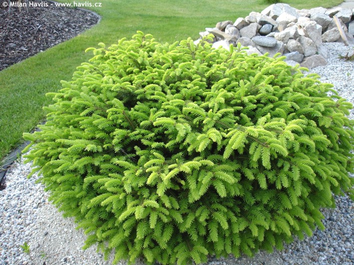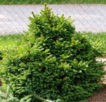 Ялина звичайна (Pіcea abіes) ‘Will’s Zwerg’ зона 4. Прекрасна карликова форма з вузько конічною густою кроною. Росте повільно, у віці 10 років досягає 1,2 м у висоту. Пагони жорсткі, хвоя коротка, темно-зелена. Молода хвоя світло-зелена, різко контрастує за кольором зі старою. Віддає перевагу свіжим, добре дренуючим грунтам. Рекомендується для невеликих садиб.