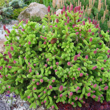 Ялина звичайна (Picea abies) ‘Pusch’ зона 4. Оригінальна карликова форма, з напівкулястою кроною. У віці 10 років досягає 0,3 м заввишки. та 0,5 м у діаметрі. Характерною рисою є маленькі червоні шишки на кінцях пагонів. Вимоги до ґрунту та вологи невисокі. Рекомендується для кам’янистих садів та альпінарію.