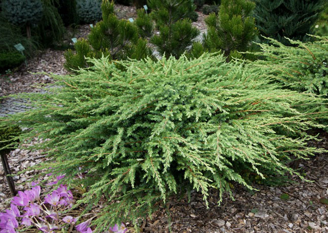 Ялівець прибережний (Juniperus conferta) ‘Schlager’ зона 6А. Розлога, повільноросла форма, у віці 10 років досягає 0,2 м у висоту та 1 м у діаметрі. Хвоя довга, зелена, колюча. Невимоглива до ґрунту та вологи. Рекомендується для кам’янистих садів та альпінаріїв як ґрунтопокривна рослина.