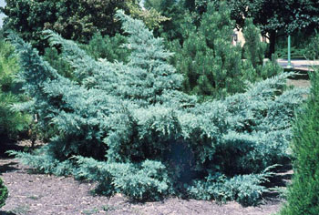 Ялівець середній (Juniperus х pfitzeriana (х media)) ‘Pfitzeriana Glauca’ зона 5A. Розлогий сорт, що швидко росте. У 10-тирічному віці Досягає до 1 м заввишки і 2 м завширшки. Старі екземпляри можуть досягти 2 м у висоту. Пагони трохи підняті. Хвоя луската і голчаста, блакитно-зелений, що переходить у сірий із срібним відтінком. До ґрунтів і вологості невимогливий. Використовується для парків та великих садів, для широких, неформованих огорож та ін.