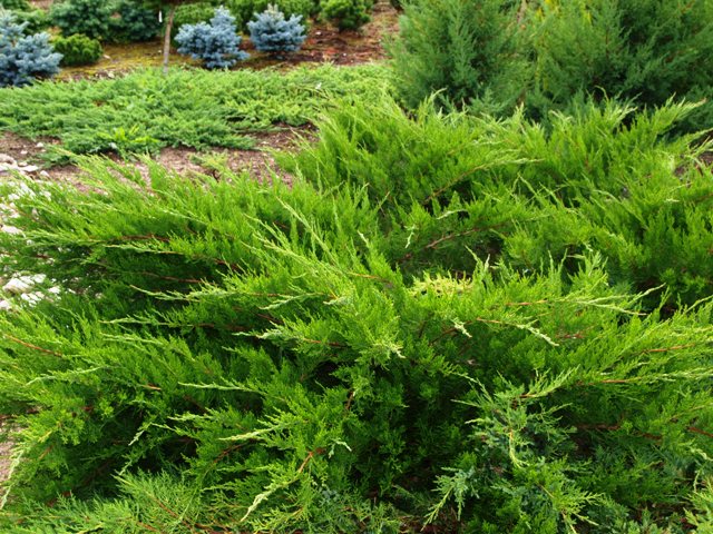 Ялівець середній (Juniperus х pfitzeriana (х media)) ‘Mint Julep’ зона 5A. Великий чагарник, що характеризується щільною чагарниковою формою та відносно сильним зростом. У віці 10 років сягає 1,5 м у висоту при діаметрі 2-3 м. Пагони яскраво-зелені. Вимоги до ґрунту та вологи невисокі. Через свої розміри рекомендується для парків та великих садів.