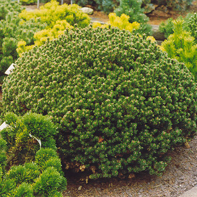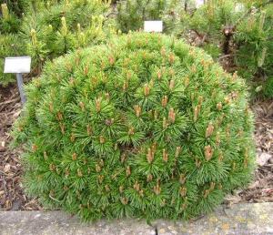 Pinus mugo (сосна горная) ‘Gnom’ зона 4. Кустарниковая форма с шаровидной, очень густой кроной. С возрастом крона становится конической. Растет медленно, в возрасте 10 лет достигает примерно 1 м в диам. Хвоя тёмно-зелёная, блестящая, 4.5-5,5 см дл, собранная по 2 в пучке. Мало требовательна к почве и влаге. Рекомендуется для каменистых и вересковых садов, контейнеров.