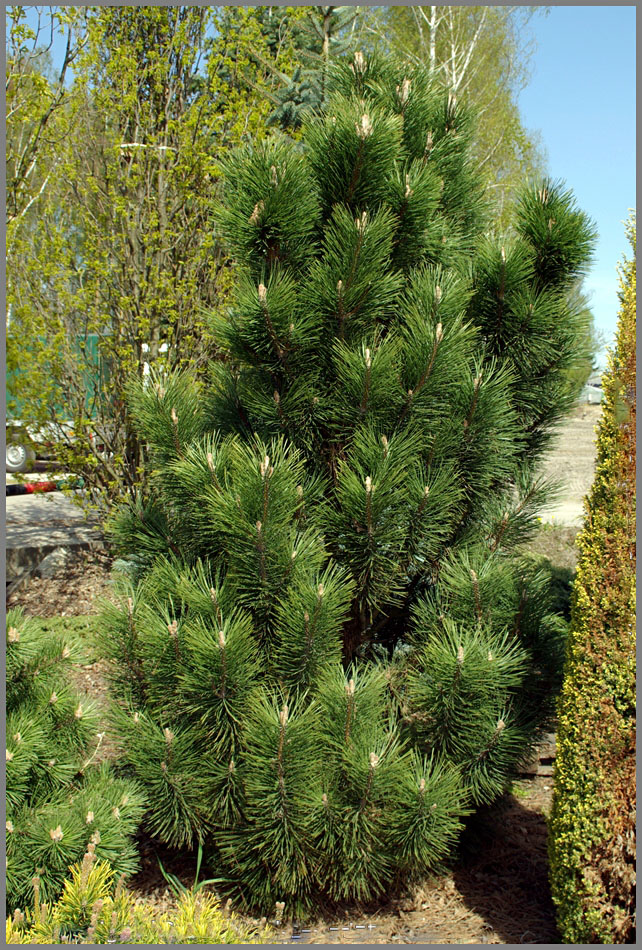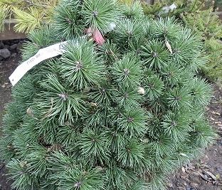 Pinus mugo var. mugo (сосна горная) зона 4. Кустарниковая, медленно растущая форма сосны, достигающая после 30 лет 2 м выс. при похожем диам., отличается, однако большой изменчивостью. Побеги короткие, поднятые, хвоя тёмно-зелёная, жёсткая, часто легко скрученная, собранная по две хвоинки. Требования к почве и влаге низкие, может расти в дюнах. Рекомендуется для каменистых садов, для укрепления откосов и выращивания в контейнерах.