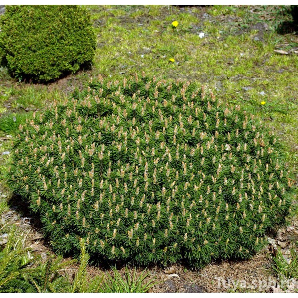 Pinus mugo (сосна горная) ‘Liliput’ зона 4. Карликовая густая сосна шаровидной формы. Медленно растущая. В 15 лет не привышает 1 м. в высоту. Хвоя короткая, тёмно-зелёная, густо расположенная. Сорт полностью морозостойкий, светлолюбивый, не требователен к почвам. Рекомендуется для каменистых и вересковых садов, контейнеров.