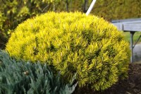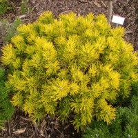 Pinus mugo (сосна горная) ‘Golden Glow’ зона 4. Вечнозеленое, карликовое дерево с куполообразной кроной. В возрасте 10 лет ее размер составляет метр на метр. Хвоя летом ярко зеленая, в зимний же период приобретает ярко желтую окраску. Сосна светолюбива, теневынослива. Засухоустойчива, зимостойкая. К почве и влаге не требовательна. Не страдает от снегопадов. Прекрасно подходит для посадки в рокариях, в групповых композициях, и как солитер.
