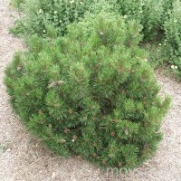 Pinus mugo (сосна горная) ‘Mops’ зона 4. Карликовая, почти шаровидная форма, очень медленно растущая, достигающая после 10 лет 0,5 м в диам. Хвоя тёмная, зелёно-голубая, собранная по две хвоинки. Требования к почве и влаге очень низкие. Рекомендуется для каменистых садов, а также для выращивания в контейнерах.