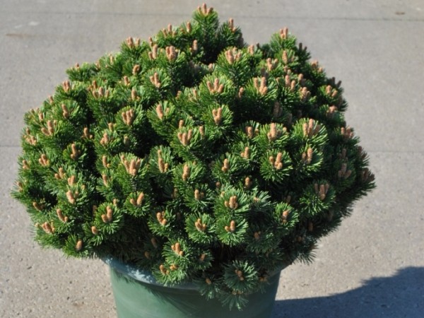 Pinus mugo (сосна горная) ‘Benjamin’ зона 4. Компактная карликовая сосна с правильной шаровидной кроной. После 10 лет достигает около 0,3 м. в высоту и 0,4 м. в ширину. Хвоя не пропорционально длинная, зелёная, лучисто расположенная. Полностью зимостойка, светолюбива, нетребовательна к почвам. Хорошо смотрится привитой на невысокий штамб. Используется для посадки на альпийских горках, вересковых садах, контейнерах.
