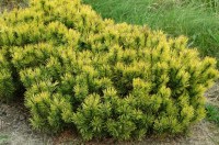 Pinus mugo (сосна горная) ‘Winter Gold’ (‘Carten’s Winter Gold’) зона 4. Карликовая, кустарниковая, медленно растущая форма сосны, достигающая после 10 лет ок. 0,5 м при диам. 1 м. Летом хвоя светло-зелёного цвета, зимой золотисто-жёлтая, собранная по две хвоинки. Требования к почве и влаге невысокие. Рекомендуется для каменистых и вересковых садов.